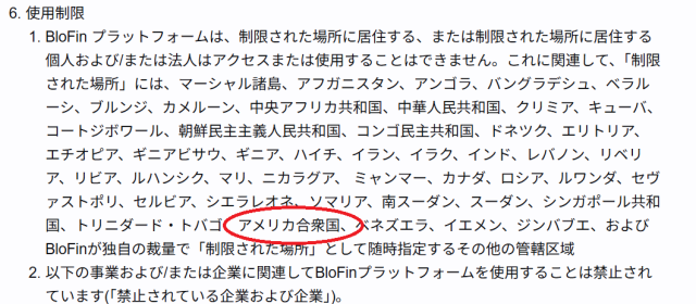実際、BloFinの利用規約に「アメリカでの利用を制限している」という記述が見つかります。