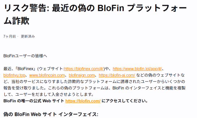 この事について、BloFinの公式サイトでも注意喚起が為されています。